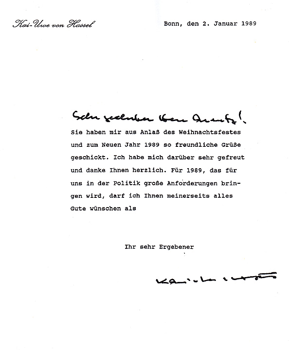 (Foto: Brief von Kai-Uwe von Hassel an Kurt Arentz)